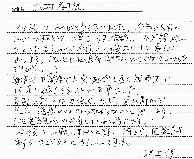 洗濯物にエンジンの排ガスの臭いがついたらヤダ... 特に小さい赤ちゃんがいらっしゃるご家庭は気をつかいますよね? そんな心配いりません。 実際に電動草刈機で作業していた時です。 『排気ガスの臭いが全然しなくて 、草のにおいしかしませんね。』 |