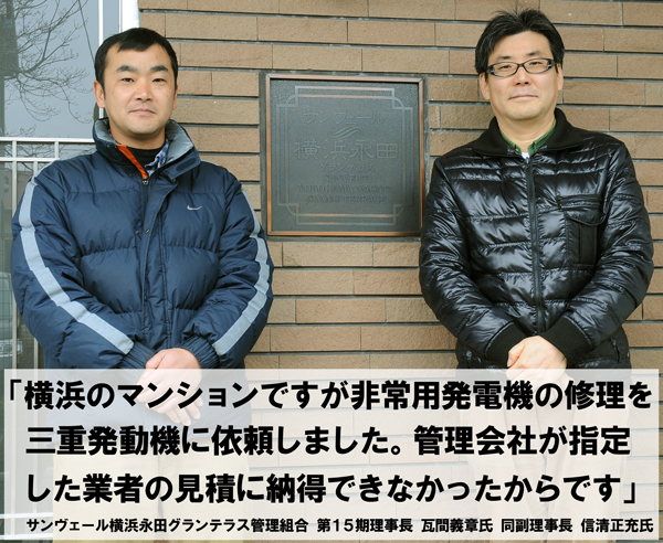 神奈川県横浜市のマンション、サンヴェール横浜永田グランテラスの管理組合では、エレベーターの非常用発電機の修理を、三重発動機に依頼しました。管理組合15期理事長の瓦間義章氏と同副理事長の信清正充氏に、三重発動機を利用した経緯、利用しての評価などをうかがいました。